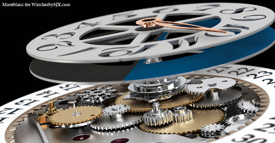 Obwohl es einfach zu lesen ist, ist der Mechanismus hinter dem Tag und Nacht-Indikator komplex. Die blaue und schwarze Tag / Nacht-Disc dreht sich je nach Tageszeit mit einer anderen Geschwindigkeit. Von neun bis drei (und umgekehrt) ist die Scheibe nicht verlobt und zeigt die gleiche Farbe. Aber nach drei schaltet sich die Scheibe ein und dreht sich mit zunehmender Geschwindigkeit, so dass der Farbwechsel für Tag oder Nacht später passieren kann. Um 4:30 Uhr dreht sich die Tag / Nacht-Scheibe mit der gleichen Geschwindigkeit wie die Stunden-Disc; Und bei sechs zeigt die Scheibe halb schwarz und blau. Nach 7:30 Uhr verlangsamt die Scheibe, bis neun, wenn die Scheibe ausschaltet und bis drei aufhört. Dies geschieht durch einen maltesischen Kreuzmechanismus mit zwei Nocken, ähnlich dem AP Starwheel und Urwerk 103.