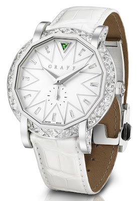 Mit einem Automatikwerk und einem ausbalancierten Gewicht, das exklusiv für Graff Luxury Watches entworfen wurde, verfügt der GraffStar über eine atemberaubende Lünette mit einem Mosaik-Design aus Trilliant- und Dreieckschliff-Diamanten, die an die perfekt geschnittenen Facetten eines Graff-Diamanten erinnern. die Seiten der Lünette und Laschen, wobei die Spitze der Laschen in Weißgold verbleibt, um die Illusion von Zacken zu geben, die einen Diamanten an Ort und Stelle halten.